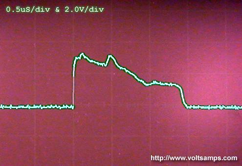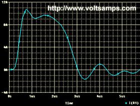 This is the graph of the current through the impedence, R1, in the above schematic. As you can see the output pulse is relatively flat. The reason for the wave-like behavior and initial current overshot is because there are only 4 meshes in the above circuit. The radial PFN will act as infinite meshes and should thus have a flatter pulse.