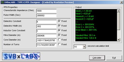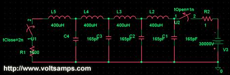 This is a standard type-e PFN schematic with 4 meshes. This PFN was designed to provide a 2uS pulse through a 1600 Ohm characteristic impedence, which is what is needed in order to power a 2J56 50kW X-Band pulsed magnetron. The radial PFN project will be designed for the same values in order to demonstarte that it is practical for real world applications, such as radar.