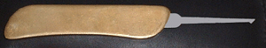 Diamond pick: As you become a little better at lock picking this is the pick of choice for scrubbing. They are available in many different sizes but you will probably find the smaller more tapered edge type is the most versatile. The brass handle that you see is typical. The pick is held in place with a couple of hex head set screws. These can be loosened so that the handle may except other picks.
