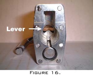 On our test subject it doesn't matter as we can see ( figure 16 ). The cylinder when in place can pull the lever either left or right. Not all locks are the same, especially when it comes to dead bolts. Before you do anything with a lock you must determine which way to turn the cylinder.