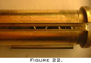 If we remove this bar the Medeco cylinder reacts to picking as can be expected from any other cylinder. The test to the reader here is to be able too identify just when this bar is free. Taking a look at the columns in figure 20 you will notice that their is a cutout (about 20%) into the plug which restricts the key pins to rotate within this constraint. This is not very encouraging as it severley decreases the odds of proper aligment by a foreign object. Furthermore The alignment is not static (figure 22), it varies from lock to lock which unfortunately blows away the idea of creating an alignment jig.