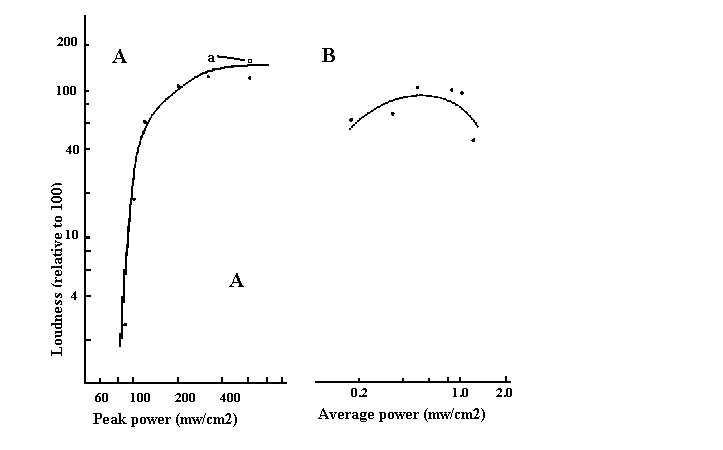 Once a minimum pulse width is used, perceived loudness is a function of peak power (Figure 1, A & B). The location of the point for test condition 6 is in consistent with what would be expected. The data represented by this point were obtained when a 10 µsec pulse width was used. Since a consideration of all data shown in Figure 1 indicates that this pulse width is outside the optimal band for loudness, we tested the possibility that the apparent inconsistency was due to the use of a nonoptimal pulse width. We therefore presented to the subjects the same peak power, but with a pulse width within the optimal band, that is, 40 µsec. The average of the data so obtained is represented by the square labelled "a" in Figure 1A. Its location indicates that the apparent decrease in perceived loudness at test condition 6 is due more to the pulse width being less than optimal than to an actual decrease in perceived loudness at the high peak power level. The data plotted in Figure 1B indicate that, in addition to an apparent minimum pulse width, there may be a maximum pulse width defining an optimal band of pulse widths for perceived loudness. It appears that average power does not determine loudness except when it is incidentally involved in producing a minimum pulse width for optimal effect.