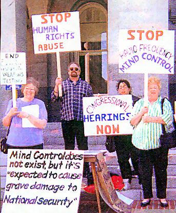 | Three protest signs, left to right: 1. Psychotronic Genocide is the work of the Central Committee Communist Party! Nuremberg-2 Inevitable! 2. SOS! Russia is in Danger of Going Psychotronic 3. No psychotronic weapons! no psychofascism! |