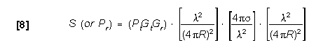 Pt in equations [17], [19], and [21] is the peak power of a CW or pulse signal. For pulse signals these equations assume the radar pulse is square. If not, there is less power since Pt is actually the average power within the pulse width of the radar signal. Equations [17] and [19] relate the maximum detection range to Smin , the minimum signal which can be detected and processed (the receiver sensitivity). The bandwidth (B) in equations [20] and [21] is directly related to Smin . B is approximately equal to 1/PW. Thus a wider pulse width means a narrower receiver bandwidth which lowers Smin , assuming no integration.