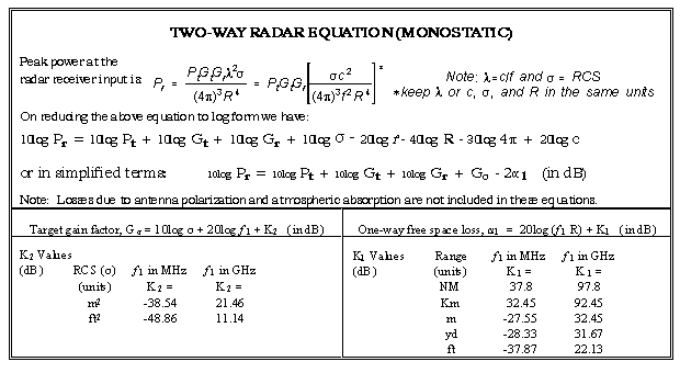 In this section the radar equation is derived from the one-way equation (transmitter to receiver) which is then extended to the two-way radar equation. The following is a summary of the important equations to be derived here: