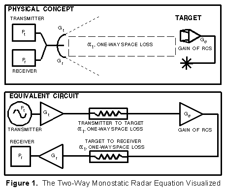 Figure 1 illustrates the physical concept and equivalent circuit for a target being illuminated by a monostatic radar (transmitter and receiver co-located).
