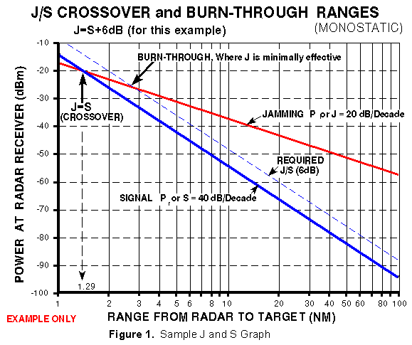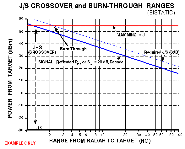 The point where the radar power overcomes the jamming signal is known as burn-through. The crossover point where J = S could be the burn-through range, but it usually isn't because normally J/S > 0 dB to be effective due to the task of differentiating the signal from the jamming noise floor (see receiver sensitivity section). For this example, the J/S required for the ECM to be effective is given as 6 dB, as shown by the dotted line. This required J/S line crosses the jamming line at about 2.8 NM which, in this example, is the burn-through range.