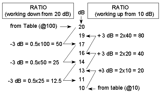 Example 2: Assume you know that the ratio for 10 dB is 10, and that the ratio for 20 dB is 100 (doubling the dB increases the power ratio by a factor of ten), and that we want to find some intermediate value.