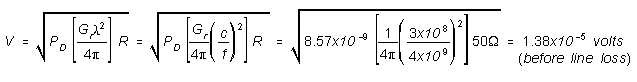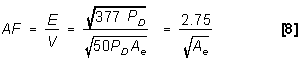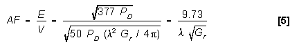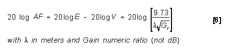 Starting with the same value of power density that we obtained above (8.57x10-9 W/m2), we find the field intensity from Table 1, in the Field Intensity / Power Density Section to be approximately 65 dBµV/m. Also from Figure 3 in this section, AF = 43 dB @ 4 GHz. (by calculating with equation [6], the exact value is 42.3 dB)