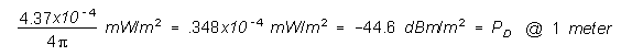 In log form: 10 Log PD = 10 Log Pr - 10 Log Ae = -80 dBm + 33.5 = -46.5 dBm/m2 at our 2 meter measuring point.