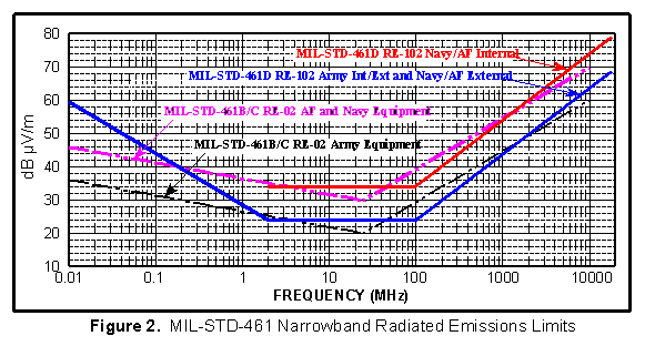 Note that in MIL-STD-461D, the narrowband radiated emissions limits were retitled RE-102 from the previous RE-02 and the upper frequency limit was raised from 10 GHz to 18 GHz. The majority of this section will continue to reference RE02 since most systems in use today were built to MIL-STD-461B/C.