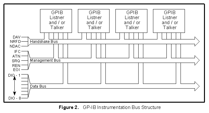 The GP-IB defines operation of a three-wire handshake that is used for all data transfers on the bus. The bus operation is asynchronous in nature. The data-transfer rate of the GP-IB is 500 kHz for standard applications and can go up 1 MHz if special conventions are followed. Each transaction carries 8 bits, the maximum data bandwidth is on the order of 4 to 8 megabits (1 M byte) per second. The bus is a two way communications channel and data flows in both directions. Figure 2 illustrates the structure of the GP-IB bus and identifies the 16 connections of the interconnecting cable.
