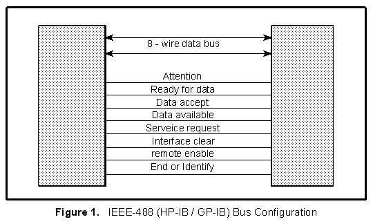 The GP-IB is a bus to which many similar modules can be directly connected, as is shown in Figure 1. A total of 16 wires are shown in the figure - eight data lines and eight control lines. The bus cables actually have 24 wires, providing eight additional for shielding and grounds.