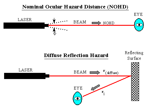 The hazard ranges of interest are the NOHD for direct viewing of a beam and the r1(safe) or r2(safe) for viewing a beam reflected off an object such as a wall. These are discussed in SPAWARINST 5100.12B and are depicted in figure 1.