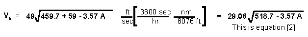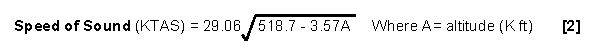 The speed of sound calculated from this formula can be used with equation [1] to obtain Mach number. This equation uses the standard sea level temperature of 59° F and a lapse rate of -3.57°/1000 ft altitude. Temperature stabilizes at -69.7° F at 36,000 ft so the speed of sound stabilizes there at 573 knots.