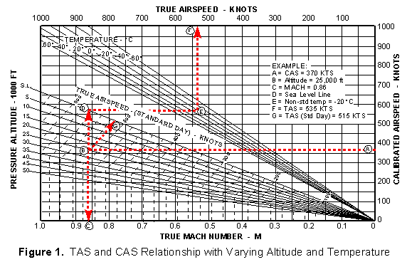 As an example of use, consider figure 1. Assume we are in the cockpit, have read our IAS from the airspeed indicator, and have applied the aircraft specific airspeed correction to obtain 370 KCAS. We start at point "A" and go horizontally to our flight altitude at point "B" (25,000 ft in this case). To find our Mach, we go down vertically to point "C" to obtain 0.86 Mach. To get our TAS at our actual environmental conditions, we go from point "B" vertically until we hit the Sea Level (S.L.) reference line at point "D", then travel horizontally until we reach our actual outside air temperature (-20° C at altitude) at point "E", then go up vertically to read our actual TAS from the scale at point "F" (535 KTAS). If we wanted our TAS at "standard" temperature and pressure conditions, we would follow the dashed lines slanting upward from point "B" to point "G" and read 515 KTAS from the scale. Naturally, we could go into the graph at any point and go "backwards" to find CAS from true Mach or TAS.