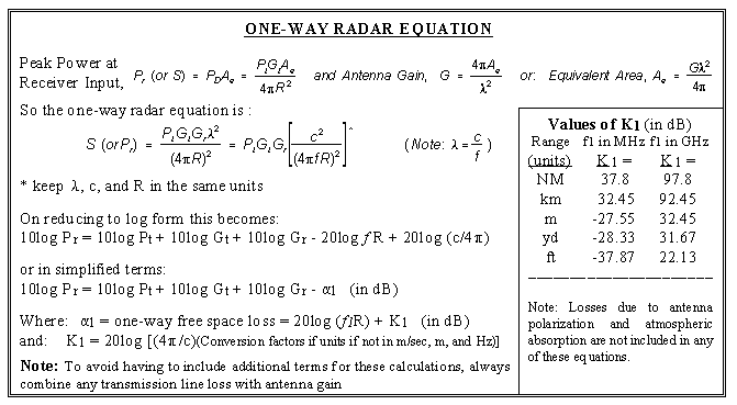 The one-way (transmitter to receiver) radar equation is derived in this section. This equation is most commonly used in RWR or ESM type of applications. The following is a summary of the important equations explored in this section: