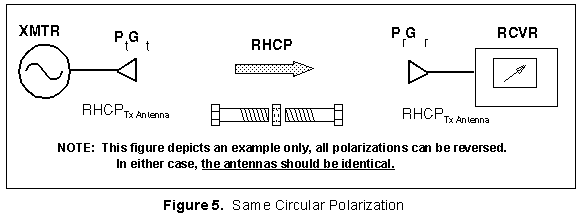 | If the desired antenna is used for receiving a direct transmission as shown in Figure 5 below, the same polarization sense (specified if transmitting) is required for maximum signal reception in this situation. Buy two right-hand or two left-hand circularly polarized antennas for this case. When you procure antennas, remember that the polarization is specified as if transmitting, regardless of intended use. |
