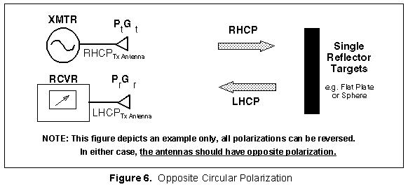 | If the desired antenna is used for a receiving a wave with a single or odd number of reflections, such as a bistatic radar where separate antennas are used for transmit and receive as shown in Figure 6, then opposite circularly polarized antennas would be used for maximum signal reception. In this case buy antennas of opposite polarization sense (one left hand and one right hand). |