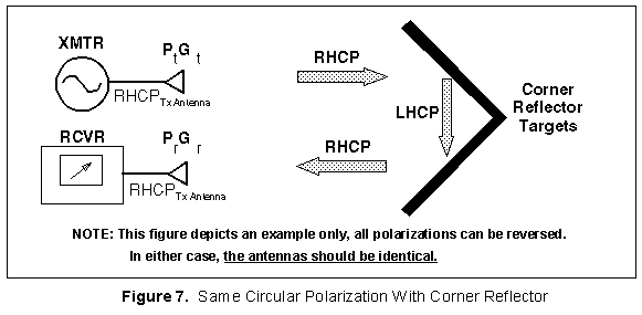 | In a corner reflector, waves reflect twice before returning to the receiver as shown in Figure 7, consequently they return with the same sense as they were transmitted. In this case (or any even number of reflections) buy antennas of the same polarization sense. |