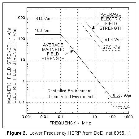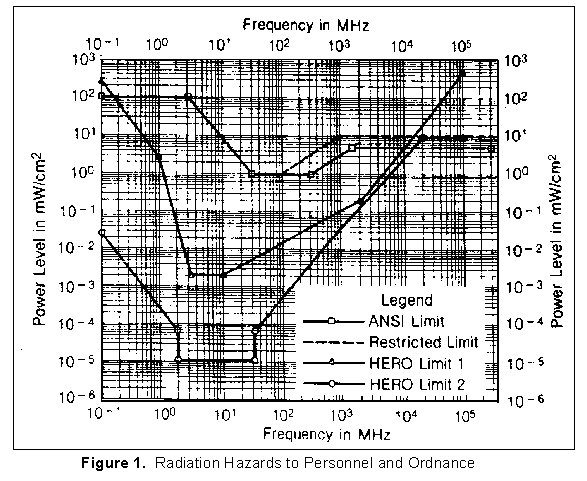 The current industrial specifications for RADHAZ are contained in ANSI/IEEE C95.1-1992 which was used as a reference to create the combined Navy regulation NAVSEA OP3565 / NAVAIR 16-1-529. Volume I contains HERP and HERF limits - its current version is REV 5. Volume II (REV 6) covers HERO. These limits are shown in Figure 1 although all values have been converted to average power density.
