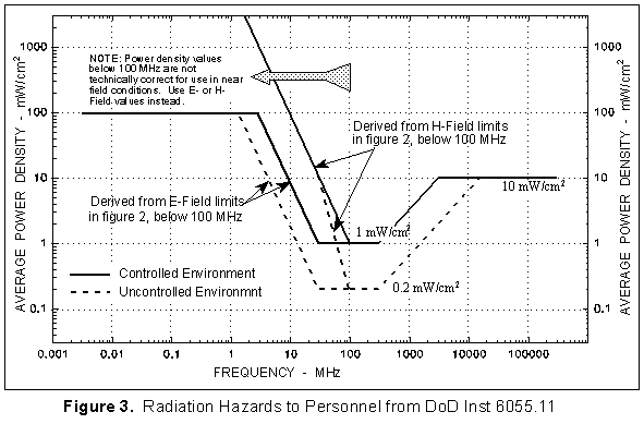 The PELs listed in Figures 2 and 3 were selected for an average RF exposure time at various frequencies. In a controlled environment, this averaging time was selected as 6 minutes for 0.003 to 15,000 MHz. If the exposure time is less than 6 minutes, then the level may be increased accordingly. Similar time weighted averages apply to uncontrolled environments, but it varies enough with frequency such that DoD INST 6055.11 should be consulted.