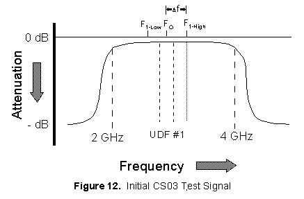 This two signal interference test places a pulse signal far enough away (f) from the desired UDF frequency (F0) that it won't be identified. A CW signal is initially placed 2f away. If an amplifier is operating in the saturated region, these two signals will mix and produce sum and difference signals. Subsequent mixing will result in a signal at the desired UDF frequency F0 since F1 - (F2-F1) = F0. These two signals are raised equally to strong power levels. If no problem occurs, the CW signal is tuned to the upper inband limit and then tuned out of band. A similar test is performed below F0.