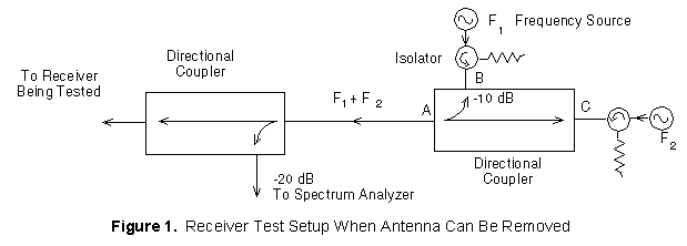 The CW signal should be applied to the coupling arm (port B) since the maximum CW signal level is -10 dBm. The pulse signal should be applied to the straight-through path (port C) since the maximum pulse level is +10 dBm peak. These power levels are achievable with standard laboratory signal generators, therefore one doesn't have to resort to using amplifiers which may distort the signals. Always monitor the output signal to verify spectrally pure signals are being applied to the test unit. This can be accomplished by another directional coupler used in the standard configuration. Dissimilar joints or damaged or corroded microwave components can cause mixing. This can also result if the two signal generators are not isolated from one another. Therefore, even if a directional coupler is used to monitor the signal line, it is still advisable to directly measure the input to the receiver whenever there is a suspected receiver failure. This test does not need to be performed in an EMI shielded room and is more suitable for a radar or EW lab where the desired signals are readily available.