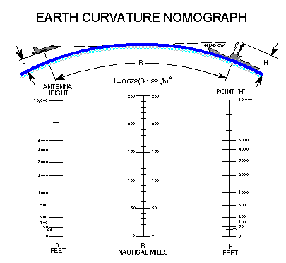 A nomograph for determining maximum target range is depicted in Figure 2. Although an aircraft is shown to the left, it could just as well be a ship, with radars on a mast of height "h". Any target of height (or altitude) "H" is depicted on the right side.