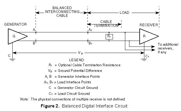 The balanced voltage digital interface circuit consists of three parts: the generator (G), the balanced interconnecting cable, and the load. The load is comprised of one or more receivers (R) and an optional cable termination resistance (RT). The balanced voltage interface circuit is shown in Figure 2.