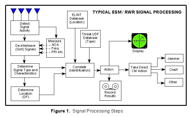 As shown in Figure 1, signal processing is basically a problem of signal detection, emitter parameter measurement and correlation, emitter sorting, identification, and operator notification. The ultimate goal of this processing is to classify radar signals by their unique characteristics and to use this data to identify enemy radars operating in the environment, determine their location or direction, assess their threat to friendly forces, and display this information to the operator.