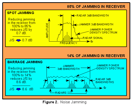 All radar receivers are frequency selective. That is, they are filters that allow only a narrow range of frequencies into the receiver circuitry. DECM, by definition, creates forgeries of the real signal and, ideally, are as well matched to the radar receiver as the real signal. On the other hand, noise jamming probably will not match the radar receiver bandwidth characteristics. Noise jamming is either spot jamming or barrage jamming. As illustrated in Figure 2, spot jamming is simply narrowing the bandwidth of the noise jammer so that as much of the jammer power as possible is in the radar receiver bandwidth. Barrage jamming is using a wide noise bandwidth to cover several radars with one jammer or to compensate for any uncertainty in the radar frequency. In both cases some of the noise power is "wasted" because it is not in the radar receiver filter.