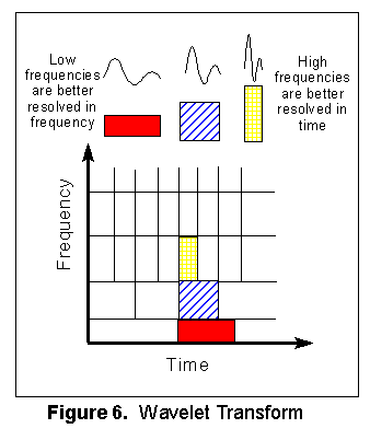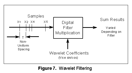 The wavelet transform has the ability to identify frequency (or scale) components, simultaneously with their location(s) in time. Additionally, computations are directly proportional to the length of the input signal. They require only N multiplications (times a small constant) to convert the waveform. For the previous eight filter bank example, this would be about twenty calculations, vice 56 for the FFT.