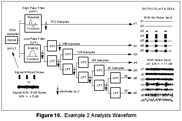EXAMPLE 2. Figure 10 shows the input of a clean signal, and one with noise. It also shows the output of a number of "filters" with each signal. A 6 dB S/N improvement can be seen from the d4 output. (Recall that 6 dB corresponds to doubling of detection range.) In the filter cascade, the HPFs and LPFs are the same at each level. The wavelet shape is related to the HPF and LPF in that it is the "impulse response" of an infinite cascade of the HPFs and LPFs. Different wavelets have different HPFs and LPFs. As a result of decimating by 2, the number of output samples equals the number of input samples.