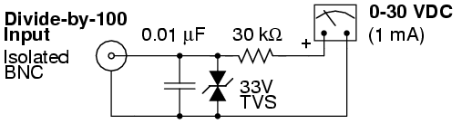 This is an optional meter which can be added to the modulator's project case to monitor the high-voltage input level. The meter is an analog 0-30 VDC meter which uses the "divide-by-100" output from the high-voltage power supply as the input. The meter has a standard 1 mA movement and a series 30 kohm or (33 kohm) resistor. A 33 volt TVS and 0.01 µF capacitor remove any voltage spikes or RF interference. The meter also uses an (optional) isolated BNC jack to avoid any ground loops.