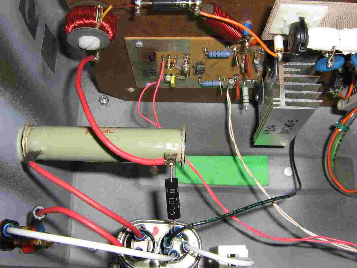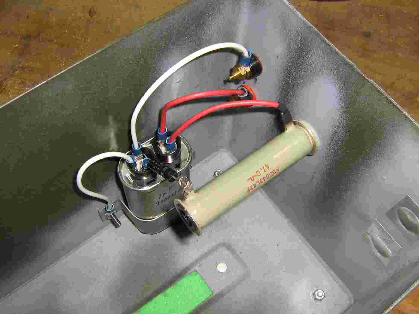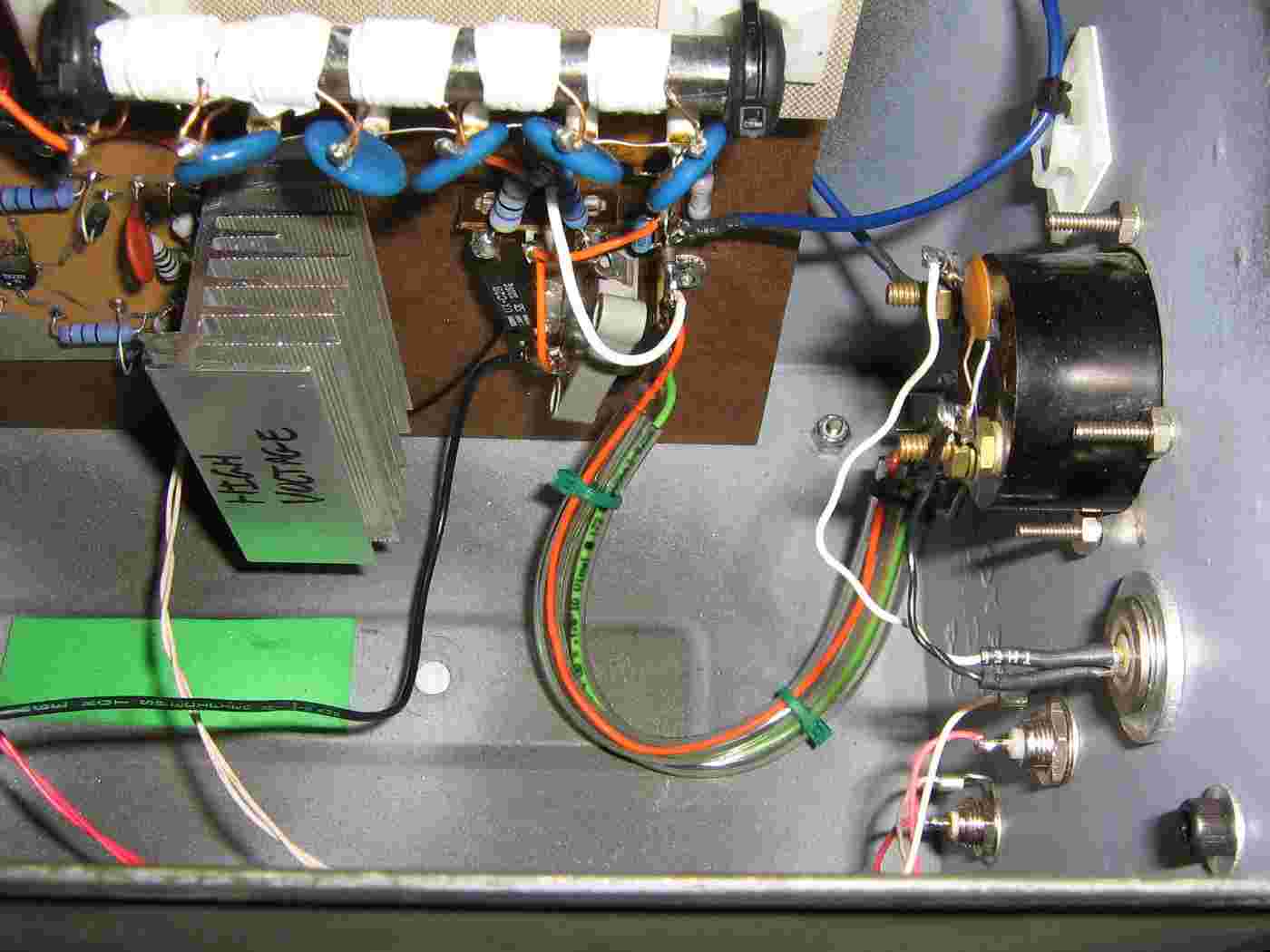 The big green cylinder is the series 47 ohm / 50 watt resistor.