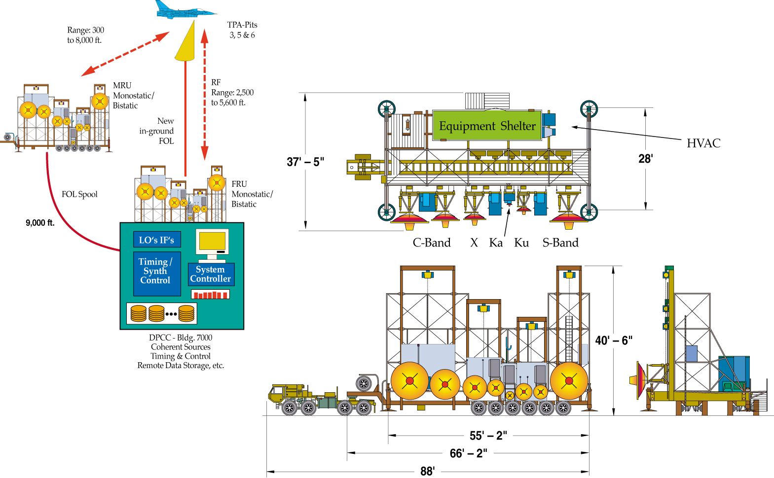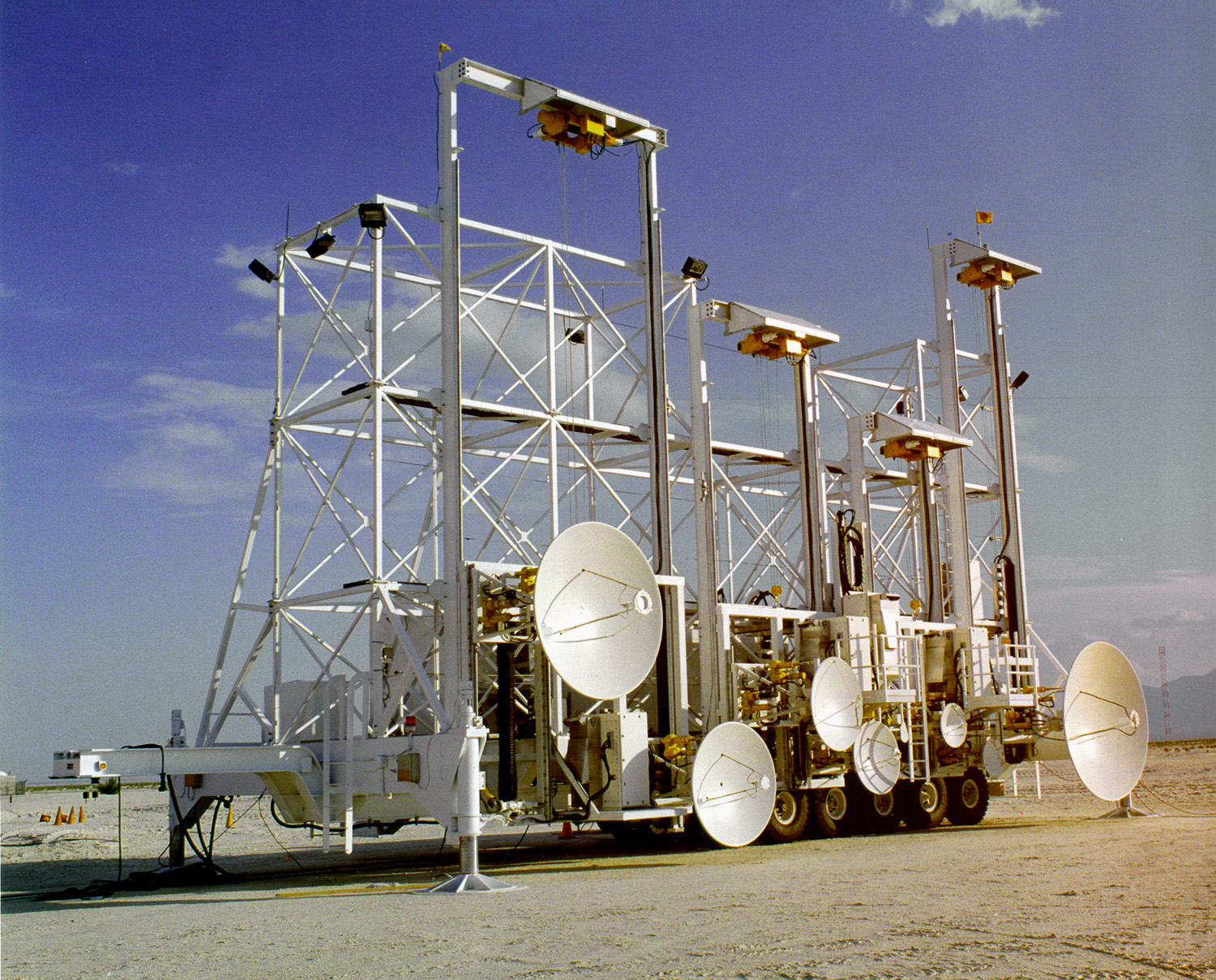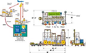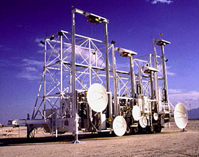 (higher-res JPEG version, 450k) On the mobile system, eight radar dishes ranging in diameter from 14inches to 10 feet ensure uniform illumination of targets up to 80 ft inlength at typical ranges of 5,600 ft. On the fixed system, the mobiledishes are duplicated, along with an additional 16-foot dish providedfor the 1-2 GHz band.