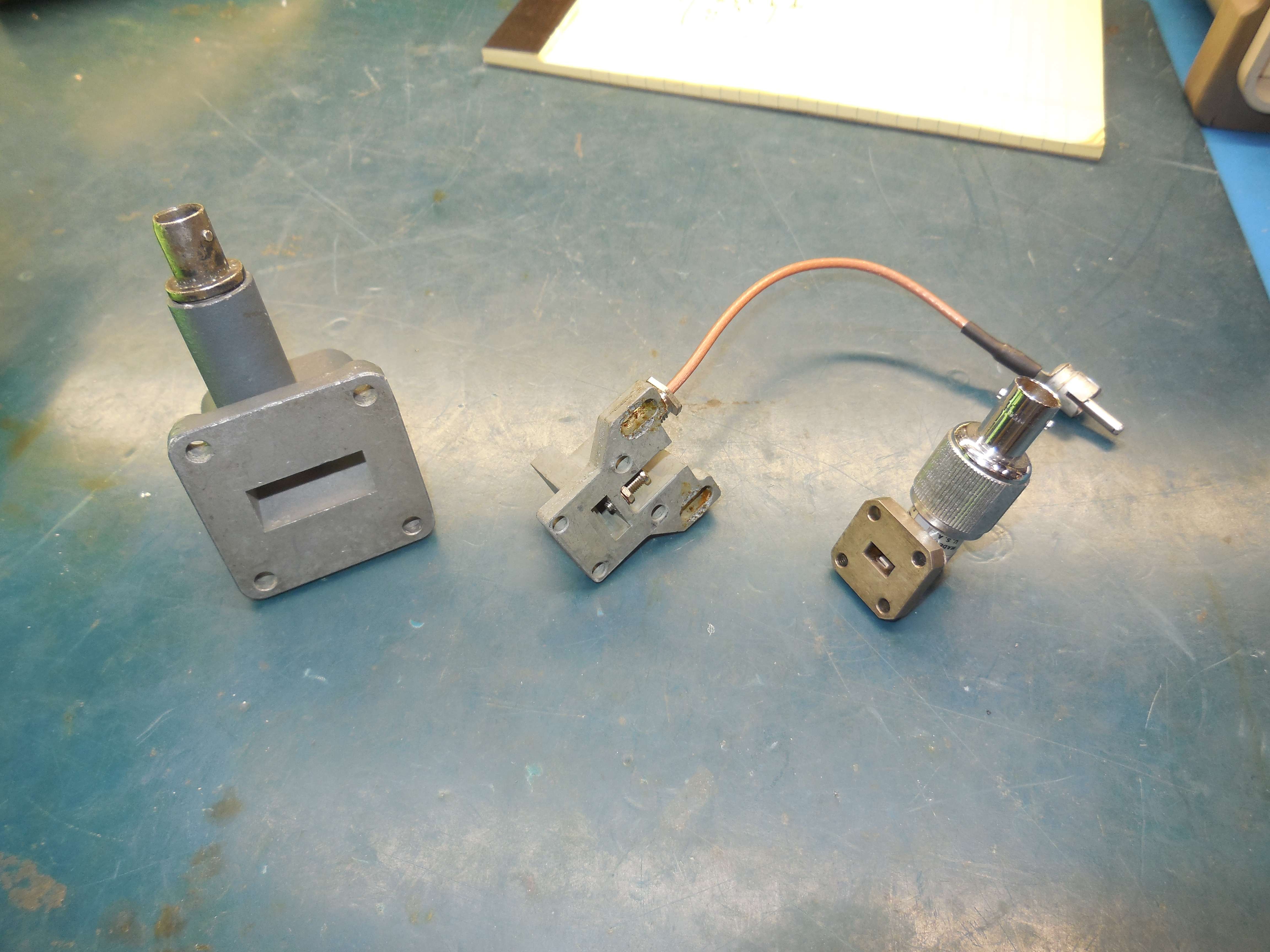 WR-90 (X-band) on the left, WR-42 (K-band, from an old radar gun) in the middle, WR-28 (Ka-Band) on the right.