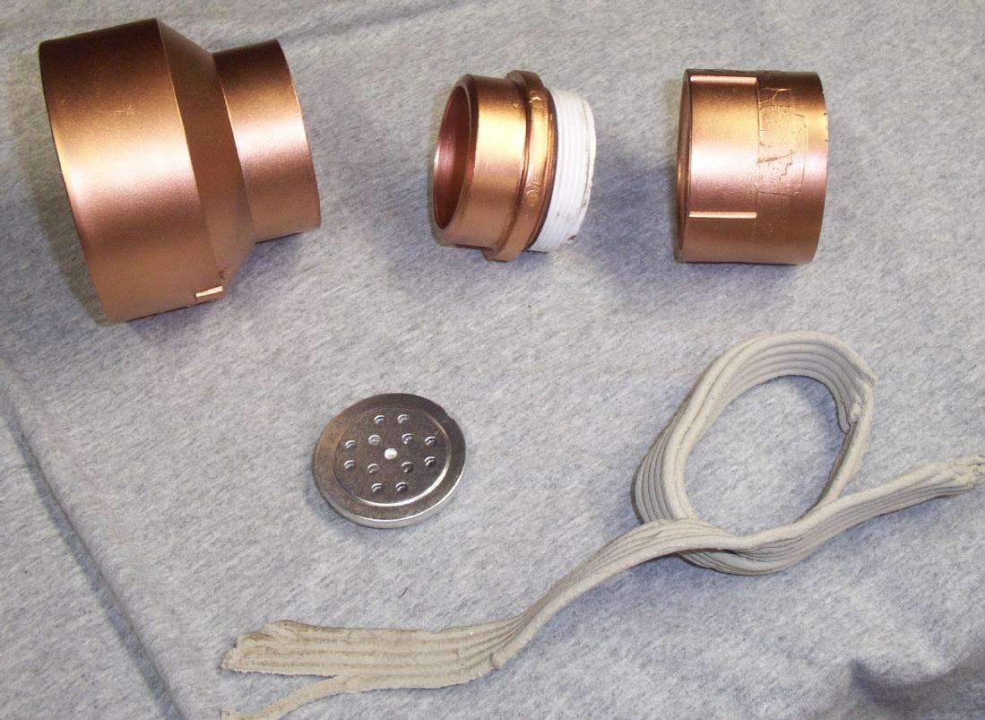 These are the components which will be needed to make the "funnel" for the audio amplifier which will attach to the back of the microphone tubes. Clockwise from the the upper left is a PVC 3-inch to 2-inch reducing coupler, a plug-in thingy to add threads to the reducing coupler, and the matching threaded coupler for that part. Next, is some rope caulk, and finally, a high-output piezoelectric microphone element, Mouser (http://www.mouser.com) part number 25LM024. I'm kinda guessing at this point, so if you can think of something better for your own design, use it.