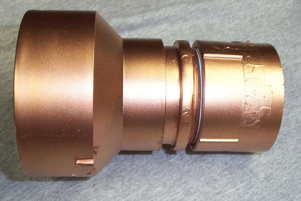 Then slide the threaded plug-in into the 3-inch to 2-inch reducing coupler. It should look something like the picture.