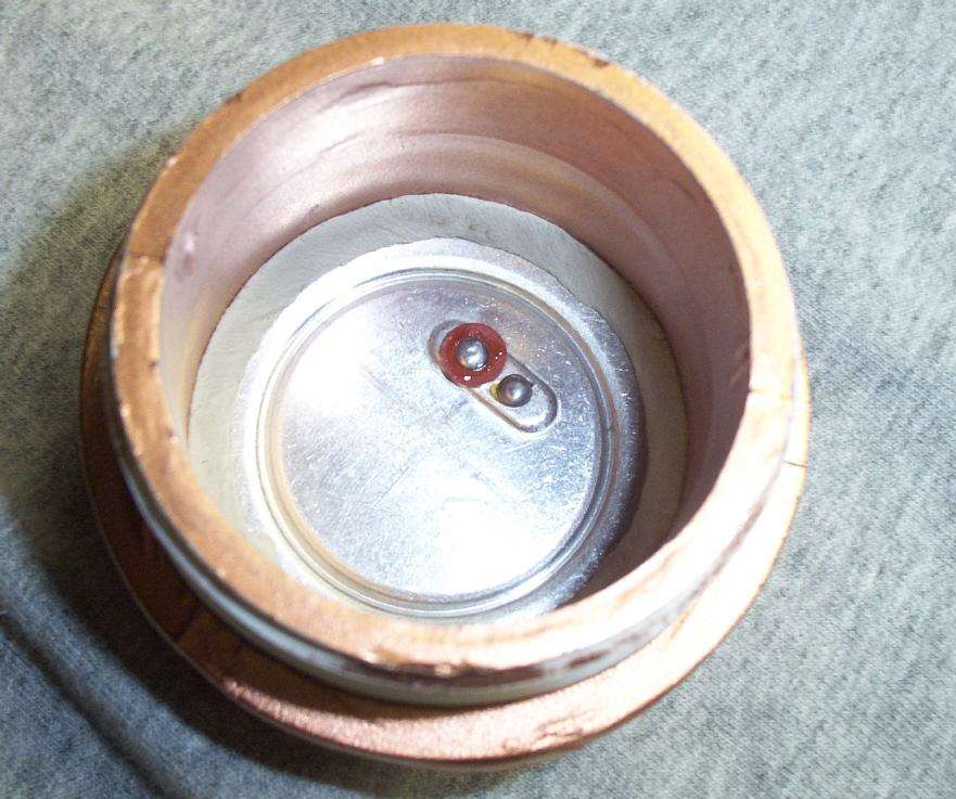 Rear view of the microphone element inside the threaded plug-in. The isolated (red) pad is the microphone's POSITIVE terminal, the other tab is CASE GROUND.