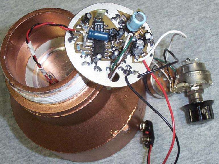 Picture of the audio amplifier board mounted between the threaded PVC adapters. The PVC end cap contains the volume control potentiometer with an integrated on/off switch. The audio output is via a 1/4-inch mono headphone jack. The end cap is taped to the other PVC pieces.