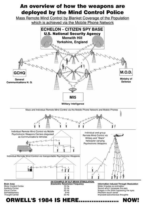 For electronic surveillance purposes, electrical activity in the speech center of the brain can be translated into the subject's verbal thoughts. RNM can send encoded signals to the brain's auditory cortex, thus allowing audio communications direct to the brain (bypassing the ears). NSA operatives can use this covertly to debilitate subjects by simulating auditory hallucinations characteristic of paranoid schizophrenia.