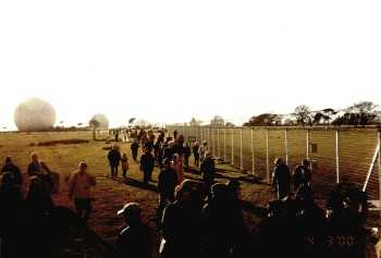 My good friend Graeme Lewis and I drove up to Echelon Citizen Spy Base and Mind Control Centre the day before the protest to check out the layout of the base. Graeme is also a survivor of Electronic/Psychotronic harassment and attack, and well versed in the use of these weapons against innocent members of the public. After sleeping in the car overnight about 500 metres from the base, we proceeded to the main gate of Echelon at 12.00 noon, where other protesting groups were already getting organised. The three other groups protesting were: Campaign for the Accountability of American Bases (C.A.A.B.), Campaign for Nuclear Disarmament (C.N.D.) and the Menwith Hill Women's Peace Camp. There were approx. 400 people protesting against Echelon's human rights and freedom abuses. Project Freedom Network was joined by 2 other survivors of Nuero-Electromagnetic Weapons assault, Marina Findlay and Justin Smith. The day was blessed with a number of speakers including