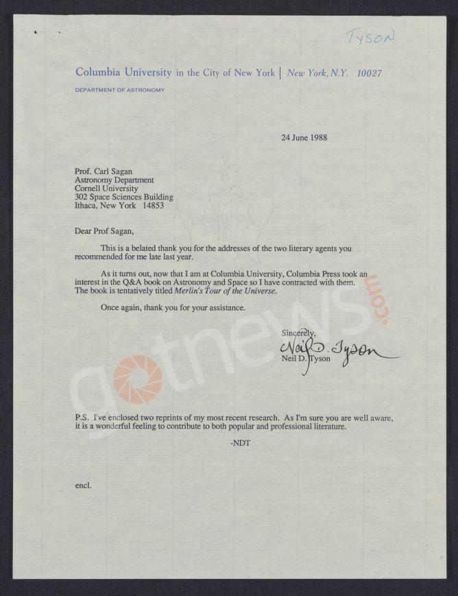 (In fact Tyson wrote to Sagan first, according to Sagan's 1975 letter. Sagan did not write to Tyson unsolicited as Tyson has repeatedly claimed.)