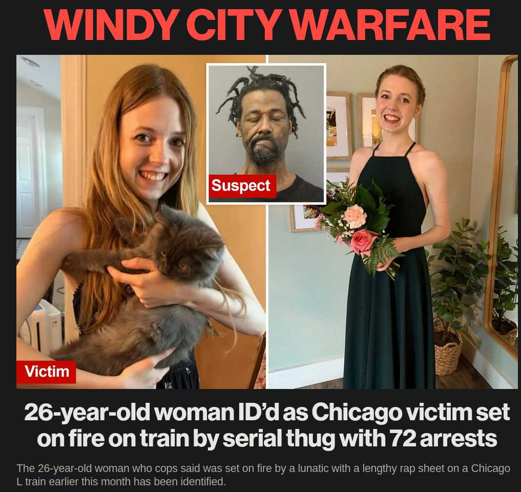- Chicago Train Fire Suspect With 70 Arrests Was Freed on Probation - Then Allegedly Set 26-Year-Old on Fire Bethany MaGee was doused in gasoline and set on fire in Chicago by a negro career criminal repeat offender with 72 prior arrests.