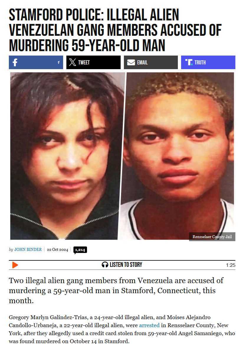 - Stamford Police: Illegal Alien Venezuelan Gang Members Accused of Murdering 59-Year-Old Man Gregory Marlyn Galindez-Trias, a 24-year-old illegal alien, and Moises Alejandro Candollo-Urbaneja, a 22-year-old illegal alien, were arrested in Rensselaer County, New York, after they allegedly used a credit card stolen from 59-year-old Angel Samaniego, who was found murdered on October 14 in Stamford.