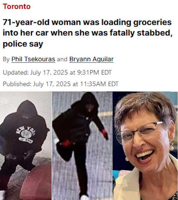 - 71-Year-Old Woman Was Loading Groceries Into Her Car When She Was Fatally Stabbed "A 71-year-old woman is dead in what Toronto police say was an 'unprovoked' stabbing at a commercial plaza in North York Thursday morning... Police have identified her as 71-year-old Shahnaz Pestonji. She is the city's 22nd homicide victim of the year."