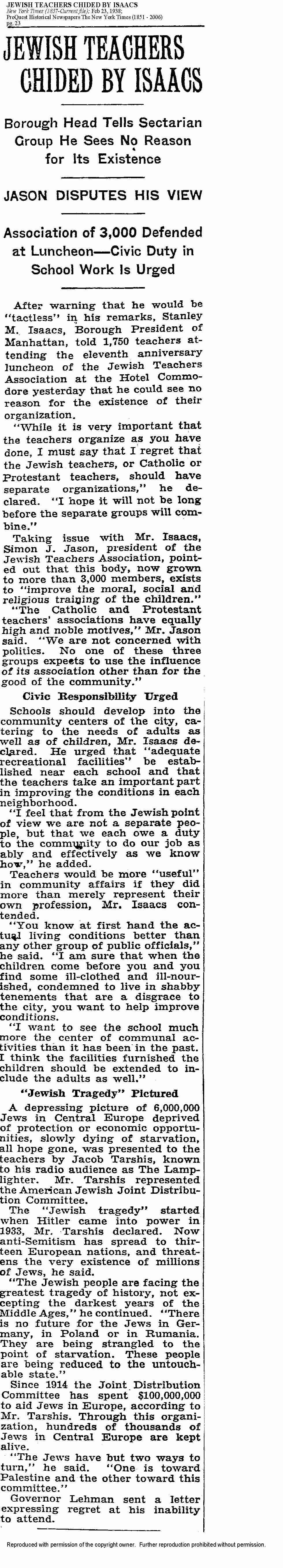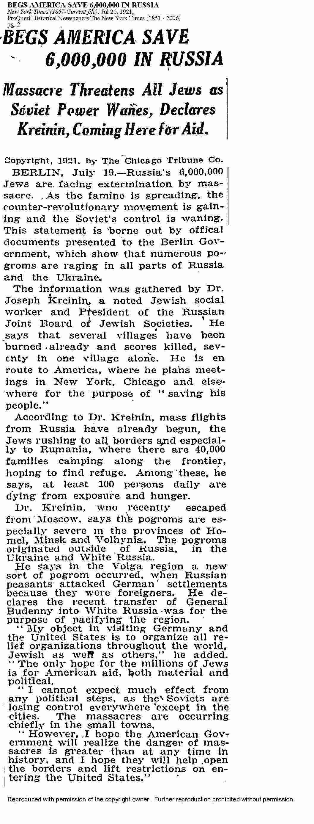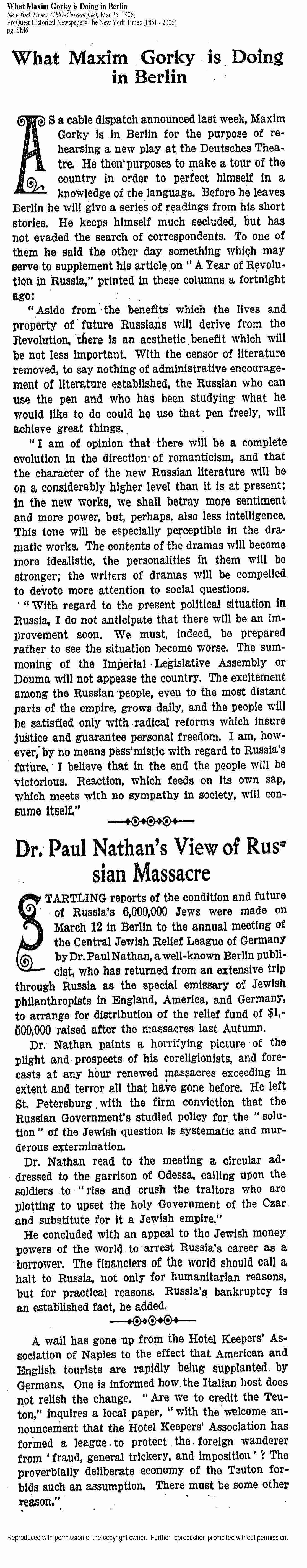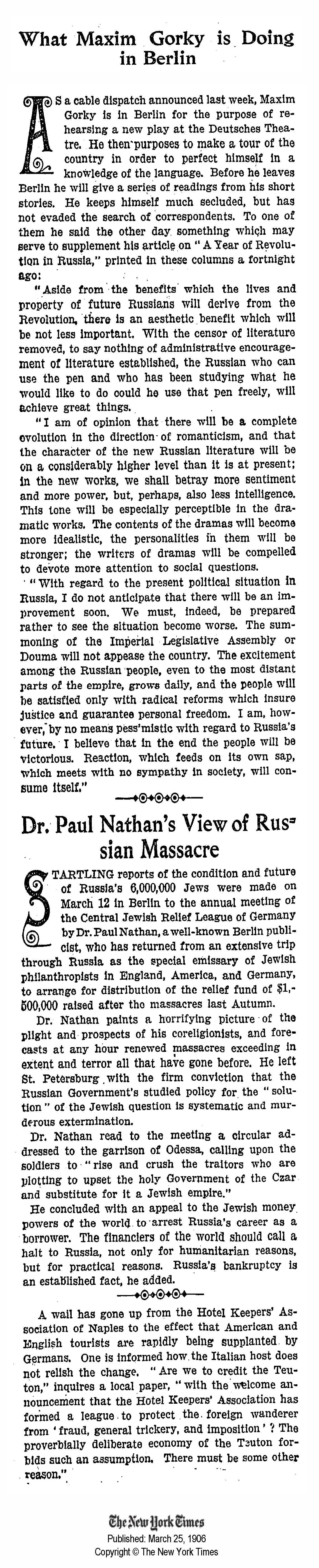 - "Startling reports of the condition and future of Russia's 6,000,000 jews were made on March 12 in Berlin to the annual meeting of the Central Jewish Relief League of Germany by Dr. Paul Nathan..."