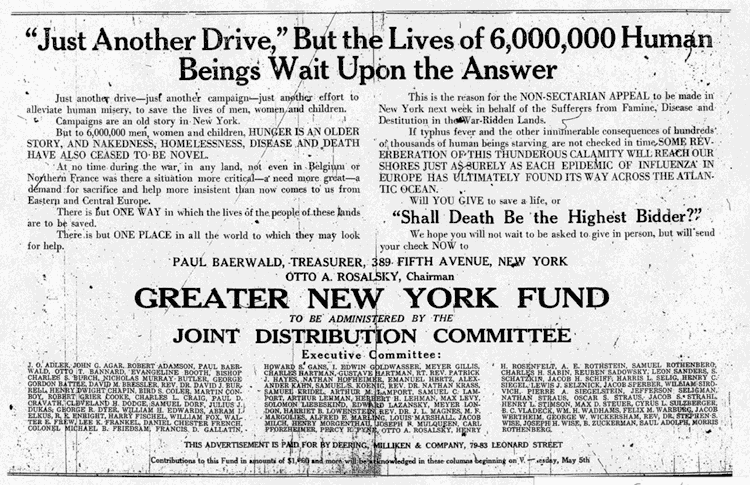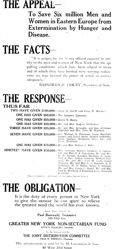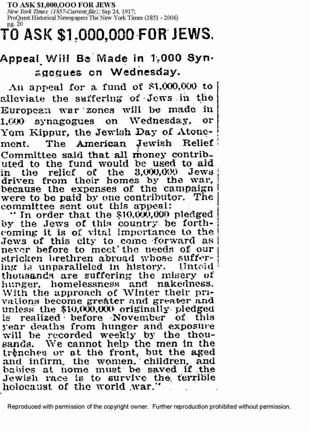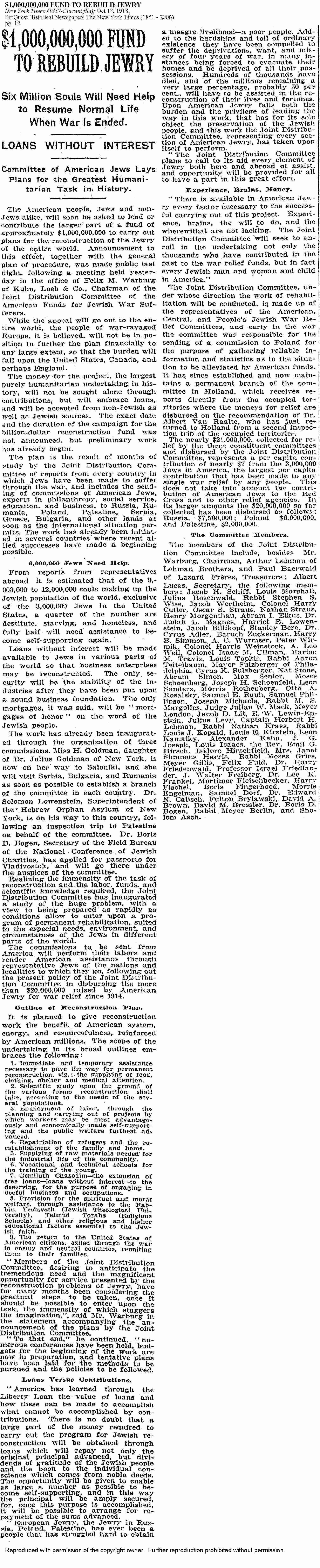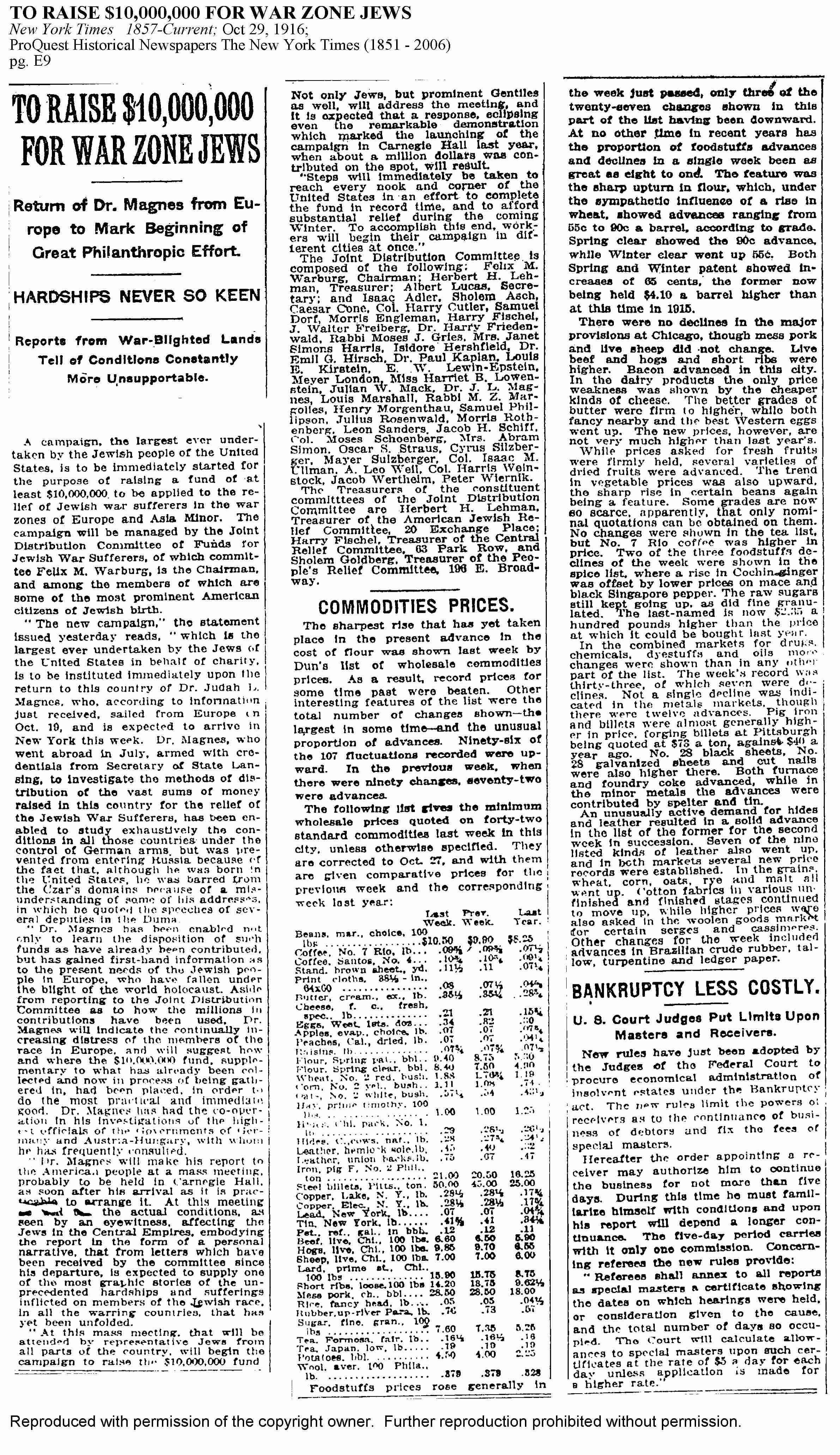 - "The American Jewish Relief Committee, called into being at a conference of more than 100 national Jewish organizations which was held at Temple Emanu-El on Oct. 25 to consider the plight of more than 6,000,000 jews who live within the war zone..."